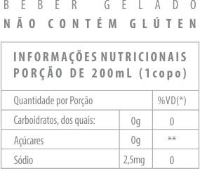 Não contém quantidades significativas de valores energéticos, proteínas, gorduras totais, gorduras saturadas, gorduras trans e fibra alimentar. (*) %valores diários com base em uma dieta de 2000 kcal ou 8400kj. Seus valores diários podem ser maiores ou menores dependendo de suas necessidades energéticas. (**)VD não são estabelecidos. Ingredientes: água mineral, aroma de melancia. Edulcorante: sucralose. Regulador de acidez: ácido cítrico. Conservadores: benzoato de sódio e sorbato de potássio.